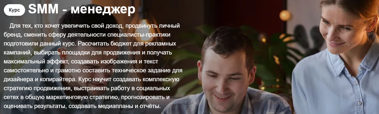 Пройдя курс, вы сможете продвигать в соцсетях компанию, в которой работаете